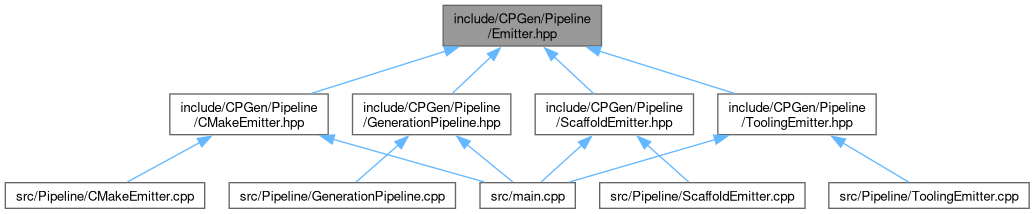 An emitter transforms a ResolvedProject into a set of output files. The GenerationPipeline collects outputs from all registered emitters and writes them to disk via std::filesystem.