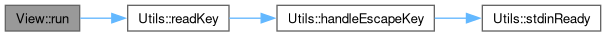 The run method constructs a Terminal (entering raw mode), then loops reading keys from stdin via Utils::readKey. Each key is first offered to the currently focused section; if not consumed, View handles Defs::Special::Tab to move focus between sections and Defs::Special::Escape to exit the loop.